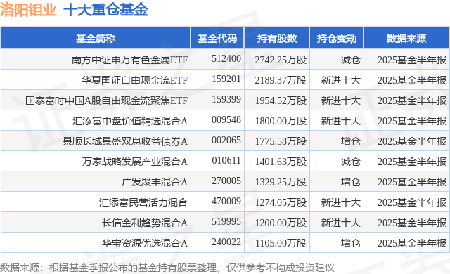 根据2025基金半年报公募基金重仓股数据,重仓该股的公募基金共190家,其中持有数量最多的公募基金为南方基金的南方中证申万有色金属ETF。南方中证申万有色金属ETF目前规模为46.95亿元,最新净值1.5332(9月26日),较上一交易日上涨0.1%,近一年上涨58.28%。该公募基金现任基金经理为崔蕾。崔蕾在任的基金产品包括:南方中证申万有色金属ETF发起联接A,管理时间为2019年7月12日至今,期间收益率为137.64%;南方中证1000ETF,管理时间为2019年7月12日至今,期间收益率为75.5%;南方红利低波50ETF,管理时间为2020年1月17日至今,期间收益率为90.61%。