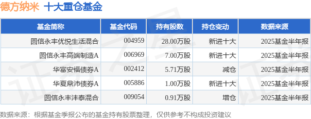 根据2025基金半年报公募基金重仓股数据,重仓该股的公募基金共5家,其中持有数量最多的公募基金为圆信永丰基金的圆信永丰优悦生活混合。圆信永丰优悦生活混合目前规模为3.26亿元,最新净值2.4445(9月26日),较上一交易日下跌0.52%,近一年上涨42.29%。该公募基金现任基金经理为党伟。党伟在任的基金产品包括:圆信永丰高端制造A,管理时间为2021年9月27日至今,期间收益率为-1.3%;圆信永丰沣泰混合,管理时间为2021年9月27日至今,期间收益率为33.05%;