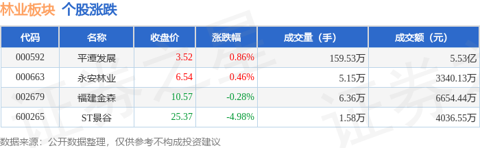 证券之星消息,9月29日林业板块较上一交易日下跌0.77%,ST景谷领跌。当日上证指数报收于3862.53,上涨0.9%。深证成指报收于13479.43,上涨2.05%。林业板块个股涨跌见下表: