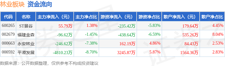 从资金流向上来看,当日林业板块主力资金净流出5097.68万元,游资资金净流入2734.0万元,散户资金净流入2363.68万元。林业板块个股资金流向见下表: