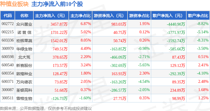 从资金流向上来看,当日种植业板块主力资金净流出112.14万元,游资资金净流入2426.07万元,散户资金净流出2313.93万元。种植业板块个股资金流向见下表: