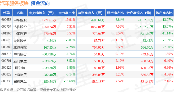 从资金流向上来看,当日汽车服务板块主力资金净流出694.67万元,游资资金净流入3378.98万元,散户资金净流出2684.31万元。汽车服务板块个股资金流向见下表: