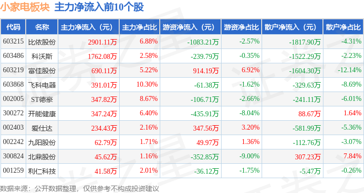 从资金流向上来看,当日小家电板块主力资金净流出1944.98万元,游资资金净流入2840.6万元,散户资金净流出895.62万元。小家电板块个股资金流向见下表:
