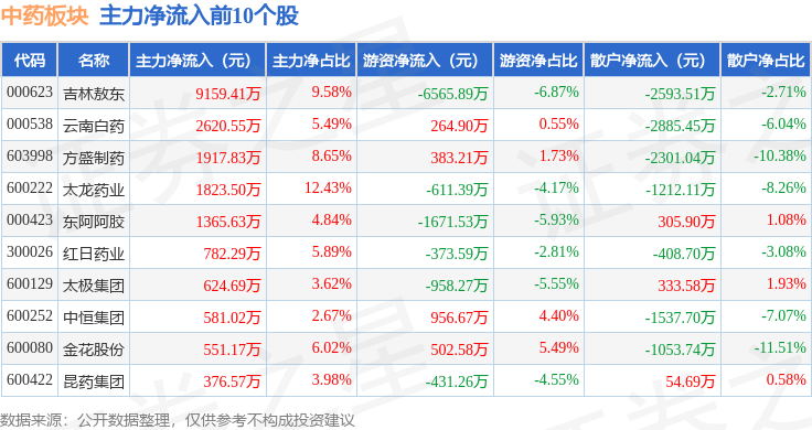 从资金流向上来看,当日中药板块主力资金净流出2.44亿元,游资资金净流入3930.98万元,散户资金净流入2.04亿元。中药板块个股资金流向见下表: