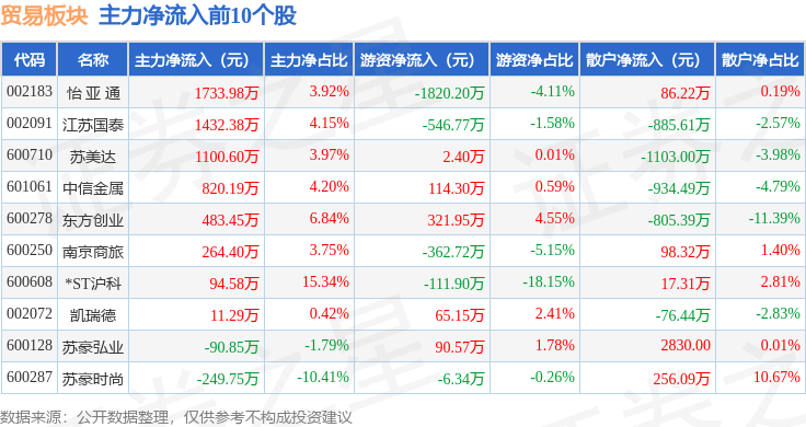 从资金流向上来看,当日贸易板块主力资金净流入4196.3万元,游资资金净流出2109.23万元,散户资金净流出2087.07万元。贸易板块个股资金流向见下表: