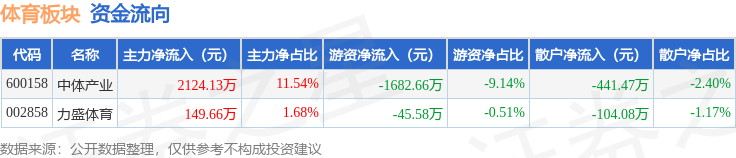 从资金流向上来看,当日体育板块主力资金净流入2273.79万元,游资资金净流出1728.24万元,散户资金净流出545.55万元。体育板块个股资金流向见下表: