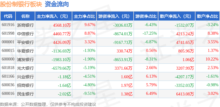 从资金流向上来看,当日股份制银行板块主力资金净流出4.45亿元,游资资金净流入2.36亿元,散户资金净流入2.09亿元。股份制银行板块个股资金流向见下表: