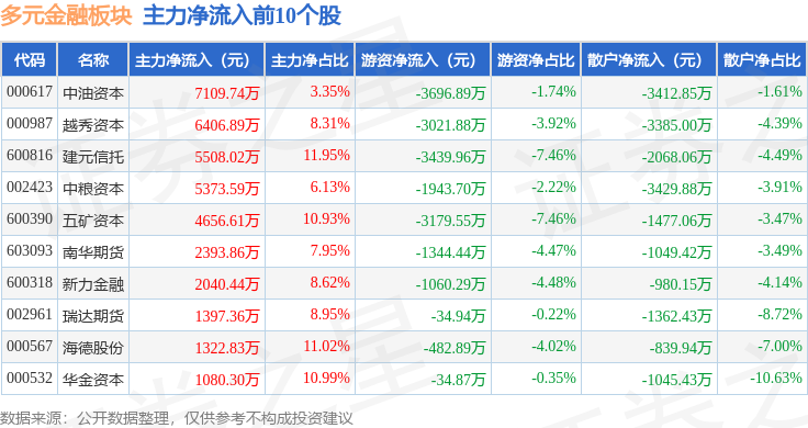 从资金流向上来看,当日多元金融板块主力资金净流入2.54亿元,游资资金净流出1.58亿元,散户资金净流出9658.09万元。多元金融板块个股资金流向见下表: