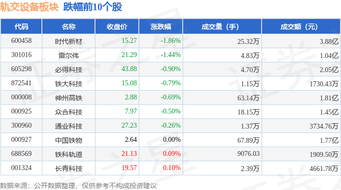 证券之星消息,9月29日轨交设备板块较上一交易日上涨0.5%,永贵电器领涨。当日上证指数报收于3862.53,上涨0.9%。深证成指报收于13479.43,上涨2.05%。轨交设备板块个股涨跌见下表: