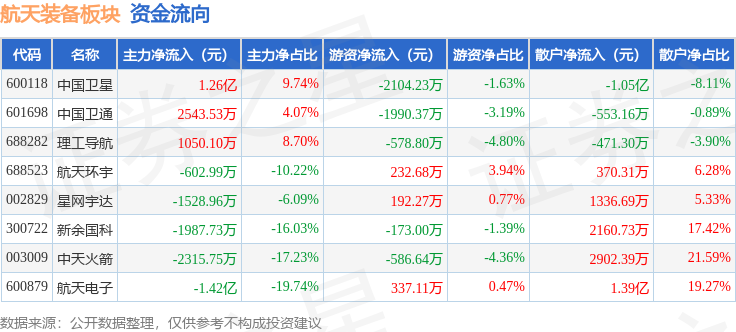 从资金流向上来看,当日航天装备板块主力资金净流出4467.34万元,游资资金净流出4670.99万元,散户资金净流入9138.33万元。航天装备板块个股资金流向见下表:
