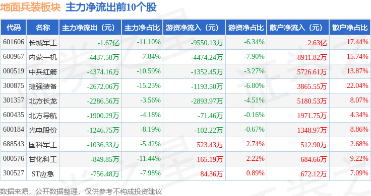 从资金流向上来看,当日地面兵装板块主力资金净流出3.73亿元,游资资金净流出2.01亿元,散户资金净流入5.73亿元。地面兵装板块个股资金流向见下表: