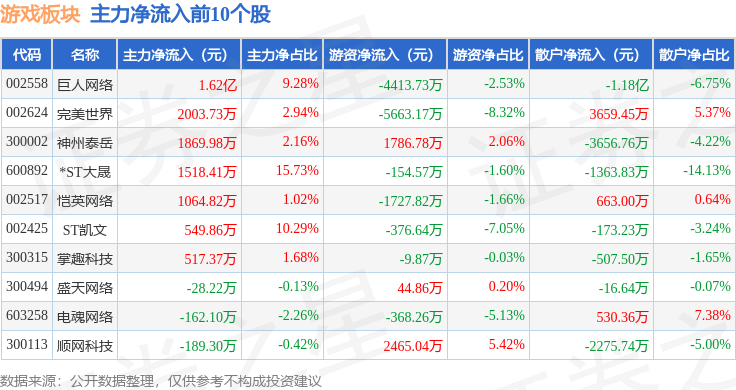 从资金流向上来看,当日游戏板块主力资金净流出5.9亿元,游资资金净流入3.1亿元,散户资金净流入2.8亿元。游戏板块个股资金流向见下表: