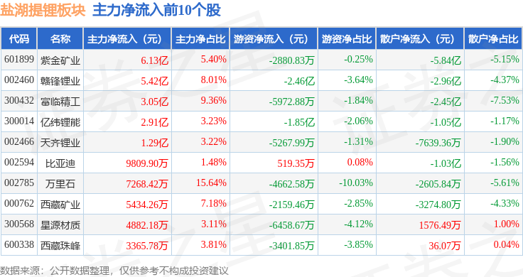 从资金流向上来看,当日盐湖提锂板块主力资金净流入17.74亿元,游资资金净流出8.06亿元,散户资金净流出9.68亿元。盐湖提锂板块个股资金流向见下表: