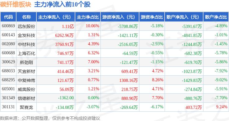 从资金流向上来看,当日碳纤维板块主力资金净流出3.34亿元,游资资金净流入1005.97万元,散户资金净流入3.24亿元。碳纤维板块个股资金流向见下表: