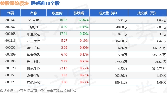 从资金流向上来看,当日参股保险板块主力资金净流出4551.88万元,游资资金净流出1.58亿元,散户资金净流入2.03亿元。参股保险板块个股资金流向见下表: