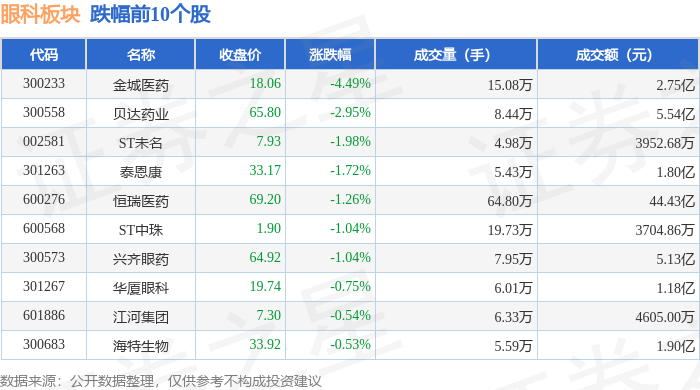 证券之星消息,9月29日眼科板块较上一交易日下跌0.43%,金城医药领跌。当日上证指数报收于3862.53,上涨0.9%。深证成指报收于13479.43,上涨2.05%。眼科板块个股涨跌见下表: