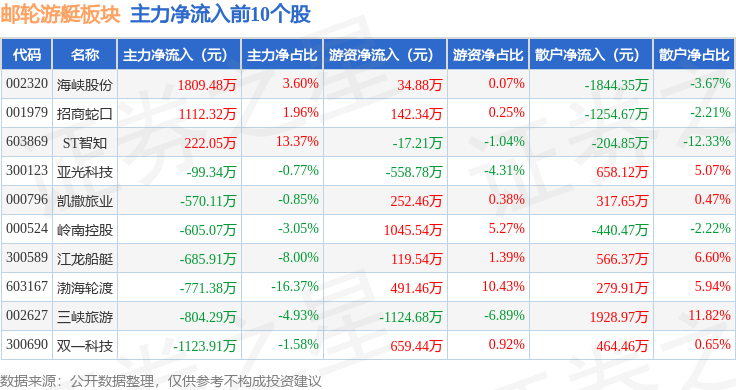 从资金流向上来看,当日邮轮游艇板块主力资金净流出5.35亿元,游资资金净流入1.61亿元,散户资金净流入3.74亿元。邮轮游艇板块个股资金流向见下表: