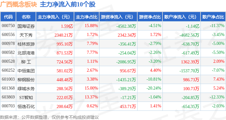 从资金流向上来看,当日广西概念板块主力资金净流出3719.3万元,游资资金净流入2867.16万元,散户资金净流入852.15万元。广西概念板块个股资金流向见下表: