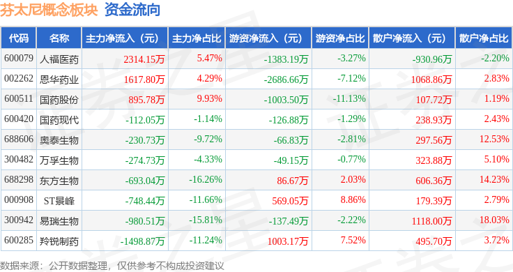 从资金流向上来看,当日芬太尼概念板块主力资金净流入289.37万元,游资资金净流出3794.8万元,散户资金净流入3505.44万元。芬太尼概念板块个股资金流向见下表: