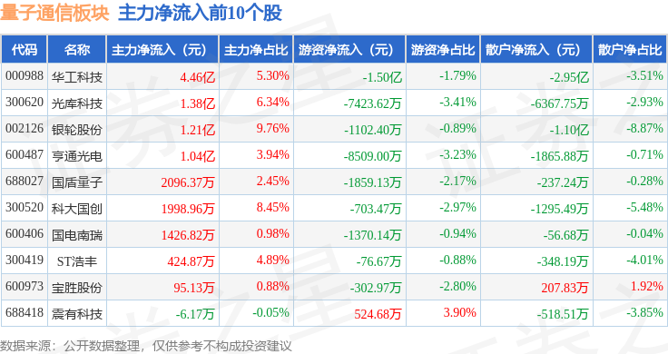 从资金流向上来看,当日量子通信板块主力资金净流出5.87亿元,游资资金净流出4.1亿元,散户资金净流入9.97亿元。量子通信板块个股资金流向见下表: