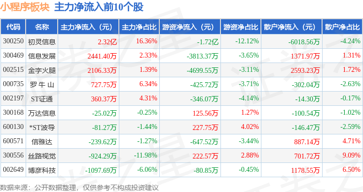 从资金流向上来看,当日小程序板块主力资金净流入9496.29万元,游资资金净流出2.1亿元,散户资金净流入1.15亿元。小程序板块个股资金流向见下表: