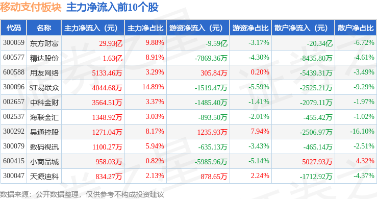从资金流向上来看,当日移动支付板块主力资金净流入18.96亿元,游资资金净流出8.45亿元,散户资金净流出10.51亿元。移动支付板块个股资金流向见下表:
