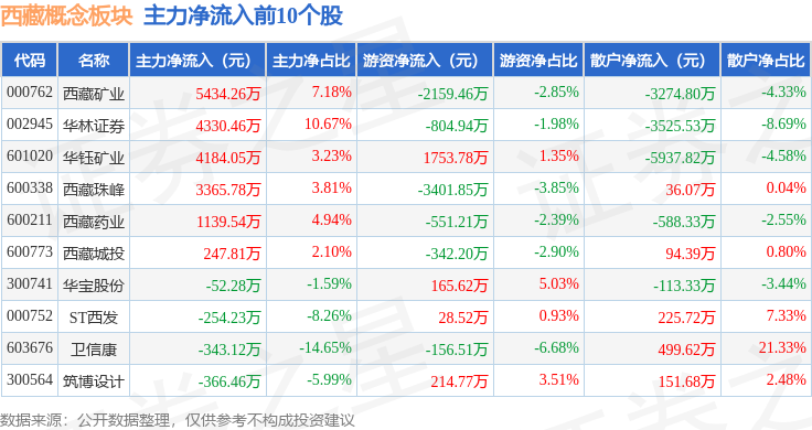 从资金流向上来看,当日西藏概念板块主力资金净流入1482.99万元,游资资金净流出5795.36万元,散户资金净流入4312.37万元。西藏概念板块个股资金流向见下表: