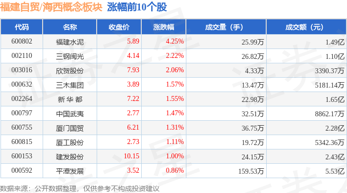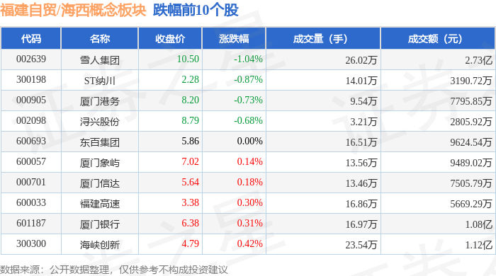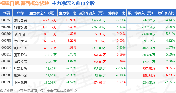 从资金流向上来看,当日福建自贸/海西概念板块主力资金净流出8055.57万元,游资资金净流入929.74万元,散户资金净流入7125.83万元。福建自贸/海西概念板块个股资金流向见下表: