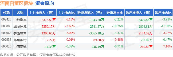 从资金流向上来看,当日河南自贸区板块主力资金净流入1.21亿元,游资资金净流出8206.94万元,散户资金净流出3895.38万元。河南自贸区板块个股资金流向见下表: