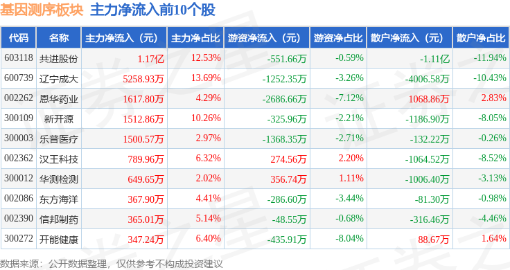 从资金流向上来看,当日基因测序板块主力资金净流出3.01亿元,游资资金净流出4162.56万元,散户资金净流入3.43亿元。基因测序板块个股资金流向见下表: