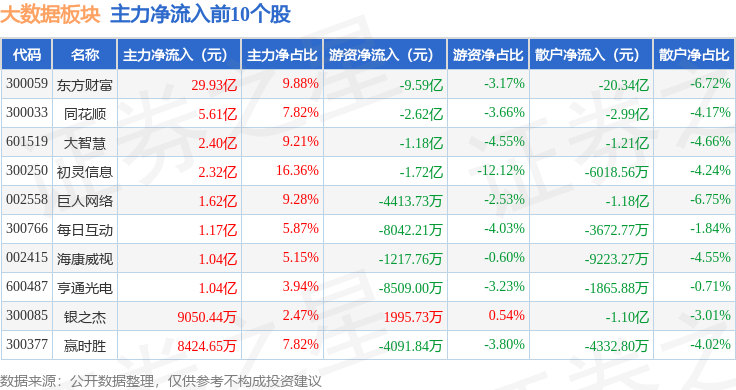 从资金流向上来看,当日大数据板块主力资金净流出5.45亿元,游资资金净流出6.37亿元,散户资金净流入11.82亿元。大数据板块个股资金流向见下表: