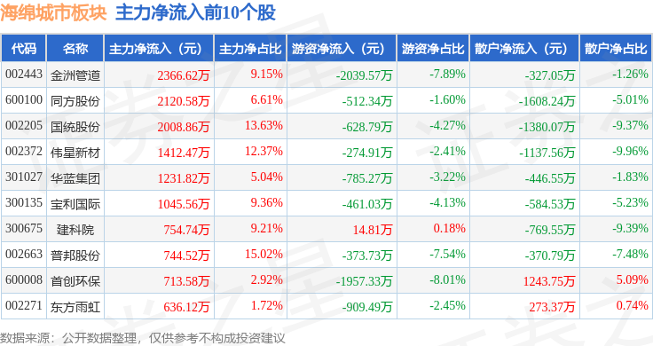 从资金流向上来看,当日海绵城市板块主力资金净流入5532.08万元,游资资金净流出6813.67万元,散户资金净流入1281.59万元。海绵城市板块个股资金流向见下表: