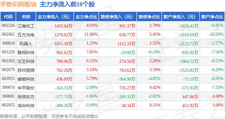 从资金流向上来看,当日手势识别板块主力资金净流出3.63亿元,游资资金净流入3463.93万元,散户资金净流入3.28亿元。手势识别板块个股资金流向见下表: