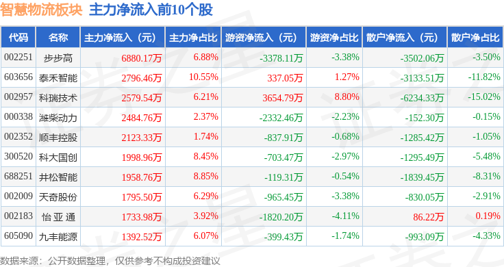 从资金流向上来看,当日智慧物流板块主力资金净流出3.95亿元,游资资金净流入3120.47万元,散户资金净流入3.64亿元。智慧物流板块个股资金流向见下表: