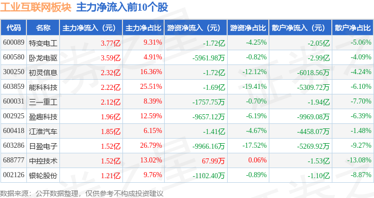 从资金流向上来看,当日工业互联网板块主力资金净流出2724.55万元,游资资金净流出7.27亿元,散户资金净流入7.54亿元。工业互联网板块个股资金流向见下表: