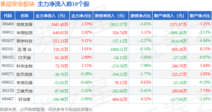 从资金流向上来看,当日食品安全板块主力资金净流出4.83亿元,游资资金净流入7873.12万元,散户资金净流入4.05亿元。食品安全板块个股资金流向见下表: