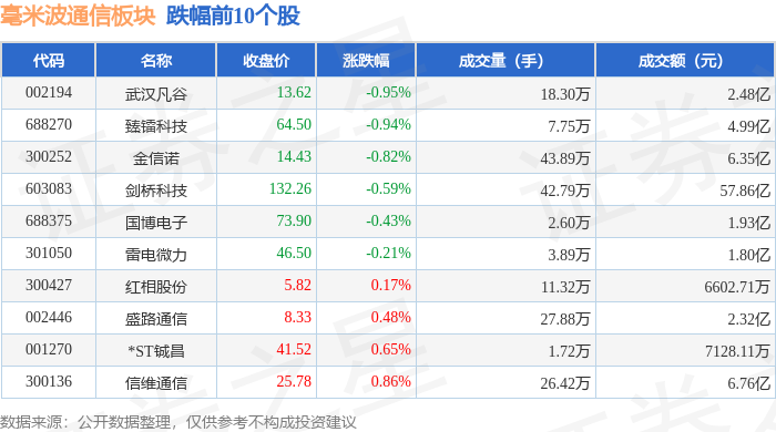 从资金流向上来看,当日毫米波通信板块主力资金净流出13.86亿元,游资资金净流入2.73亿元,散户资金净流入11.13亿元。毫米波通信板块个股资金流向见下表: