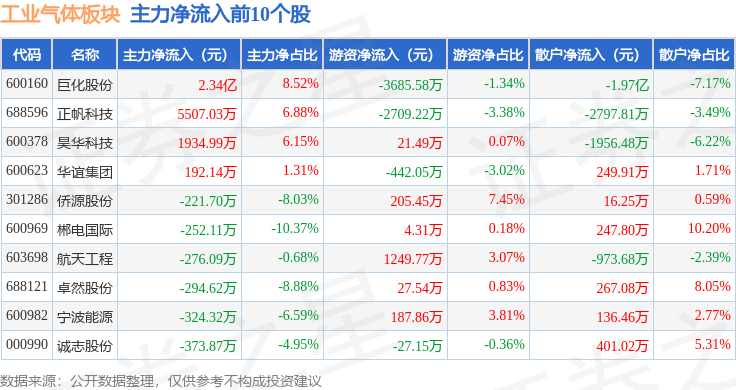 从资金流向上来看,当日工业气体板块主力资金净流出2.15亿元,游资资金净流出3924.13万元,散户资金净流入2.54亿元。工业气体板块个股资金流向见下表: