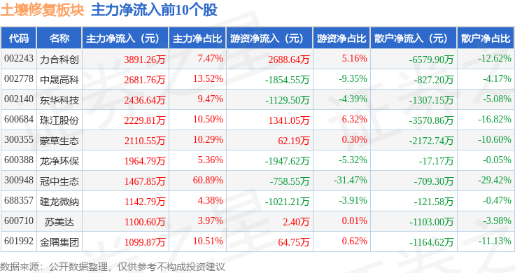 从资金流向上来看,当日土壤修复板块主力资金净流出2648.35万元,游资资金净流入4175.67万元,散户资金净流出1527.32万元。土壤修复板块个股资金流向见下表: