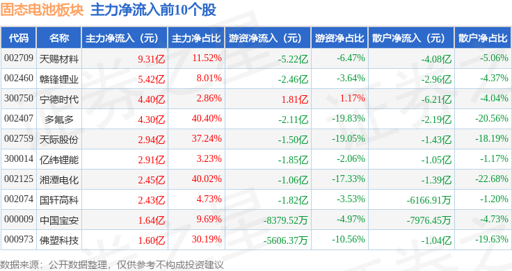 从资金流向上来看,当日固态电池板块主力资金净流入10.02亿元,游资资金净流出9.58亿元,散户资金净流出4418.79万元。固态电池板块个股资金流向见下表:
