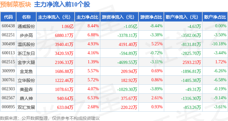 从资金流向上来看,当日预制菜板块主力资金净流入1.47亿元,游资资金净流出8108.76万元,散户资金净流出6626.22万元。预制菜板块个股资金流向见下表:
