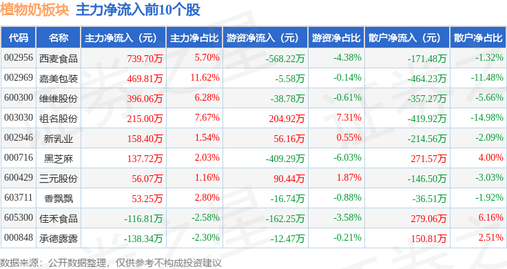 从资金流向上来看,当日植物奶板块主力资金净流出2.41亿元,游资资金净流入1.16亿元,散户资金净流入1.25亿元。植物奶板块个股资金流向见下表: