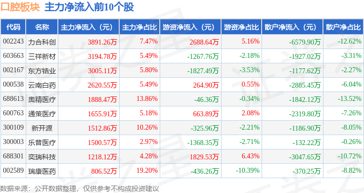 从资金流向上来看,当日口腔板块主力资金净流出1.74亿元,游资资金净流入7471.23万元,散户资金净流入9906.04万元。口腔板块个股资金流向见下表: