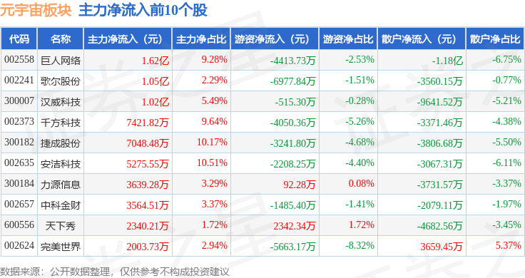 从资金流向上来看,当日元宇宙板块主力资金净流出21.67亿元,游资资金净流入3.01亿元,散户资金净流入18.65亿元。元宇宙板块个股资金流向见下表: