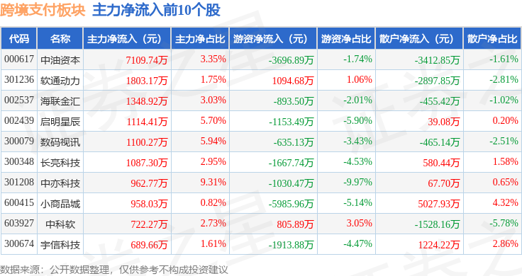 从资金流向上来看,当日跨境支付板块主力资金净流出6.13亿元,游资资金净流出2.33亿元,散户资金净流入8.46亿元。跨境支付板块个股资金流向见下表: