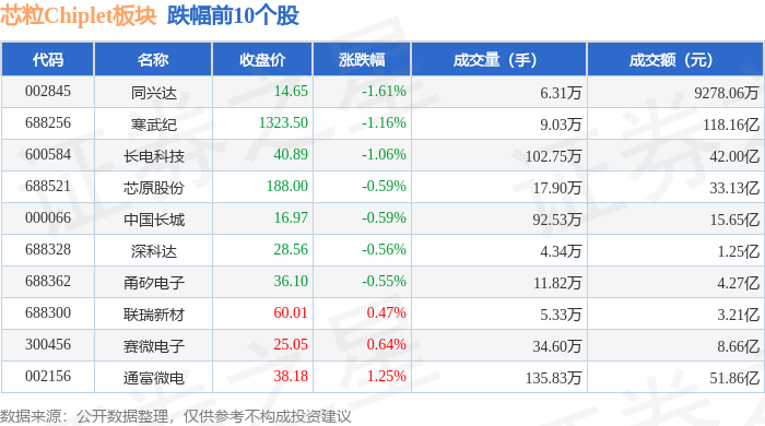 证券之星消息,9月29日芯粒Chiplet板块较上一交易日下跌0.7%,同兴达领跌。当日上证指数报收于3862.53,上涨0.9%。深证成指报收于13479.43,上涨2.05%。芯粒Chiplet板块个股涨跌见下表: