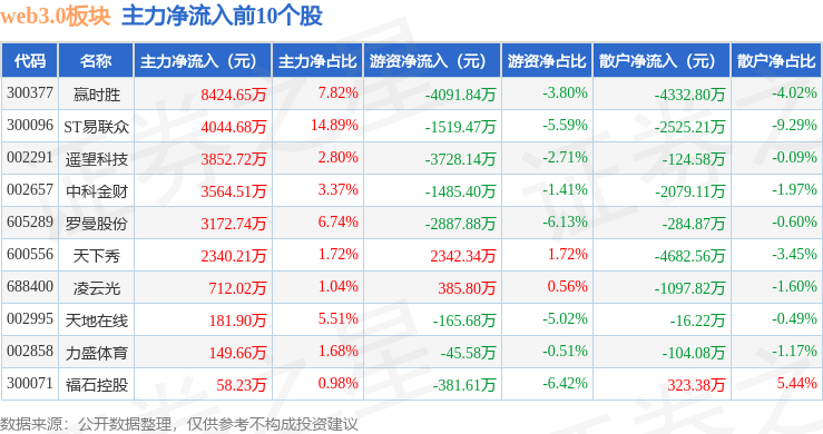 从资金流向上来看,当日web3.0板块主力资金净流出1.35亿元,游资资金净流出1.35亿元,散户资金净流入2.7亿元。web3.0板块个股资金流向见下表: