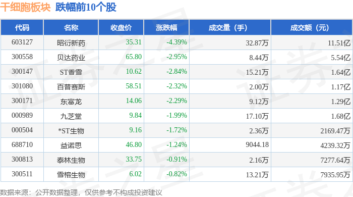 证券之星消息,9月29日干细胞板块较上一交易日下跌0.42%,昭衍新药领跌。当日上证指数报收于3862.53,上涨0.9%。深证成指报收于13479.43,上涨2.05%。干细胞板块个股涨跌见下表: