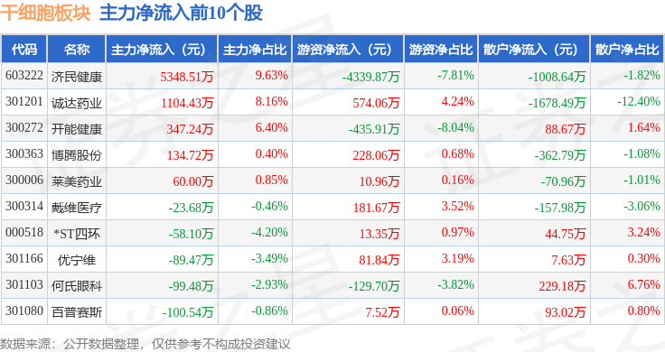 从资金流向上来看,当日干细胞板块主力资金净流出3.05亿元,游资资金净流入1771.21万元,散户资金净流入2.87亿元。干细胞板块个股资金流向见下表: