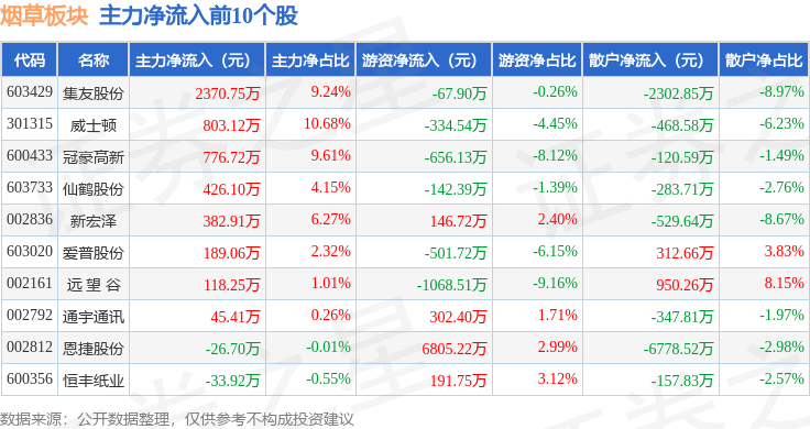 从资金流向上来看,当日烟草板块主力资金净流出1.45亿元,游资资金净流入1.05亿元,散户资金净流入4028.07万元。烟草板块个股资金流向见下表: